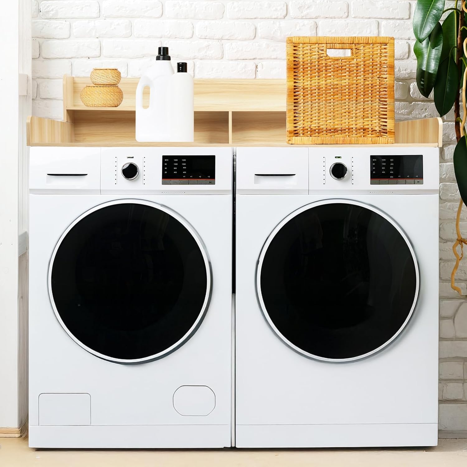 Description:Maximize Space Utilization: This laundry countertop optimizes the use of horizontal and vertical space, with a top coverage depth of 27.5" and an additional shelf layer that is 6.5" deep and 12" high, providing greater storage and operating space. The extra shelf improves space utilization, meeting the needs for folding clothes, sorting laundry, and organizing essentials.Multi-functional Storage Solution: The washer and dryer countertop not only provides space for placing laundry necessities such as detergent and fabric softener but also has multifunctionality, which can be used for sorting clothes or as a temporary workspace while making it convenient to fold clothes and keep the laundry area tidy and organized.Premium Solid Wood: This laundry topper is made of high-quality solid wood, featuring excellent durability, and waterproof properties. It is easy to maintain and clean, with its smooth surface requiring only simple wiping to keep it clean and hygienic. It weighs 41 pounds and is equipped with anti-slip pads at the bottom to reduce vibration and ensure that items placed on it remain stable and do not easily tip over.Hassle-free Washing And Drying Experience: This laundry countertop offers a convenient washing and drying experience, with three-sided 2.75" high railings effectively preventing small items like socks from falling off, while also protecting the machine from dust and scratches. Its rounded corner design eliminates the safety hazards brought by sharp corners, enhancing the safety of use. Item Name: Laundry CountertopMaterial: WoodenFeatures: Large Space, Second Storage Shelf, Anti-slip PadSize Details:L: 137cm/53.94", W: 70cm/27.56", H: 30cm/11.81" (Approx.)Guard Height: 2.75" (Approx.)Package Includes:1 x Laundry Countertop