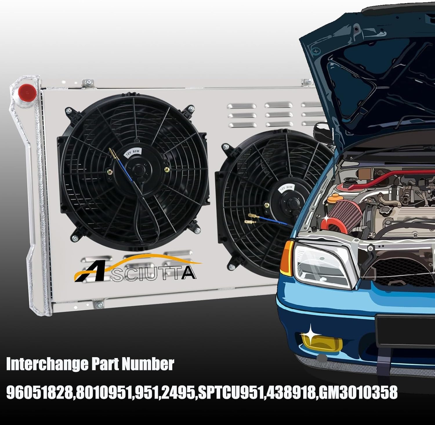 This Radiator Compatible with 1982-1992 Chevy Camaro 5.0L 1982-1984, 1986 Chevy Camaro 2.5L 1982-1984, 1986-1989 Chevy Camaro 2.8L 1982-1992 Pontiac Firebird 5.0L 1982-1989 Pontiac Firebird2.8L 1982-1986 Pontiac Firebird 2.5L 1987-1992 Chevy Camaro 5.7L 1987-1992 Pontiac Firebird 5.7L 1989 Chevy P20 5.7L 1989-1990 Chevy P30 5.7L 1989 Pontiac Firebird 3.8L 1990-1992 Chevy Camaro 3.1L 1990-1992 Pontiac Firebird 3.1L This Listing Is Including 1 X 3-Row Aluminum Radiator (Includes Radiator Cap) 1 X Aluminum Shroud 2X 12'' Fans (Includes mounting kits) 1 X Thermostat Relay Kit Radiator Details Core Row: 3 Row Material: Full Aluminium Radiator Cap: Included Core and Tank: All Aluminum Radiator Flow: Down Flow OEM style brass petcock drain CNC machined filler neck and cap Fan Size Maximum Fan CFM: 1730 cfm Fan Diameter (in): 12.050'' Thickness (in): 2.500'' Number of Blades: 10 blades Maximum Fan RPM: 2,250 rpm Blade Material: Plastic Amp Draw: 12.70 amps Includes the Mounting Tabs for an Easy Zip Tie Installation Thermostat Kit RED + connect directly to battery WHITE wire to ignition switch power source BLACK goes to thermos switch BLUE wire goes to the FansPart number 951, SBR951, CU951, CC951, RAD951, DPI951, MC951, 52453813, 1605-370193, RA1029, 0918A, 918, 731880, 96051828, 8010951, 951, 2495, SPTCU951, 438918, GM3010358