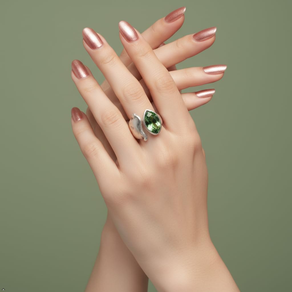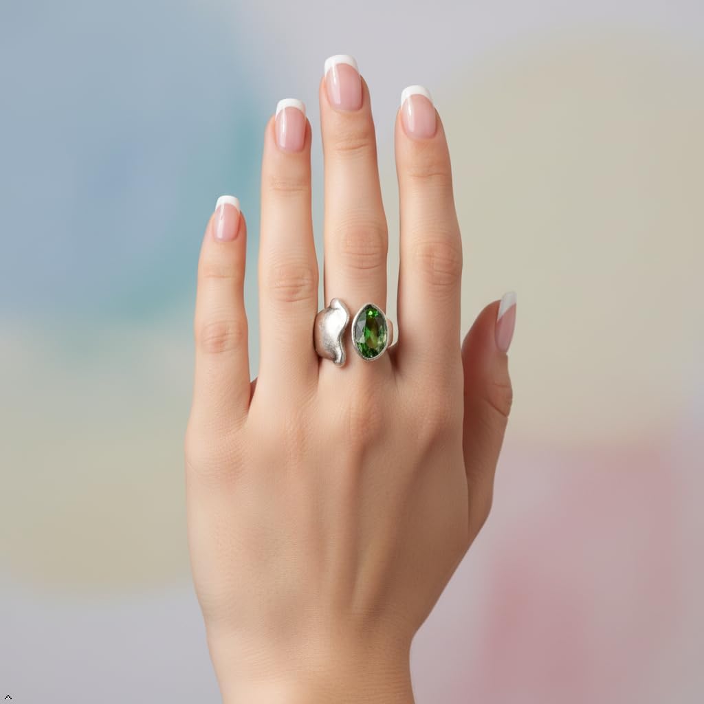 Unleash verdant bohemian power with Emerald Crescent, a captivating adjustable silver-plated pewter statement ring featuring a bold, open-band crescent design that dramatically frames a large, faceted oval emerald-green crystal, radiating intense sparkle and mystical allure with every gesture. Handcrafted from premium lead-free, nickel-free, hypoallergenic pewter with deep oxidized edges and a burnished silver finish for rich vintage depth, this tarnish-resistant beauty comfortably fits sizes 6-9 without irritation, offering customizable style for any finger. The substantial yet comfortable wrap-around silhouette blends ancient lunar magic with modern boho drama—perfect for festivals, layering with dainty bands, evening glamour, or gifting to the free-spirited soul. Lightweight enough for all-day wear yet bold enough to stand alone, Emerald Crescent transforms everyday looks into enchanting statements—secure yours now and embrace the moonlit glow of timeless elegance.