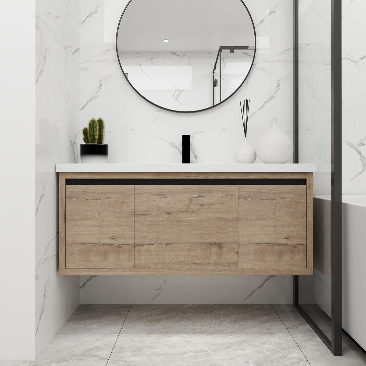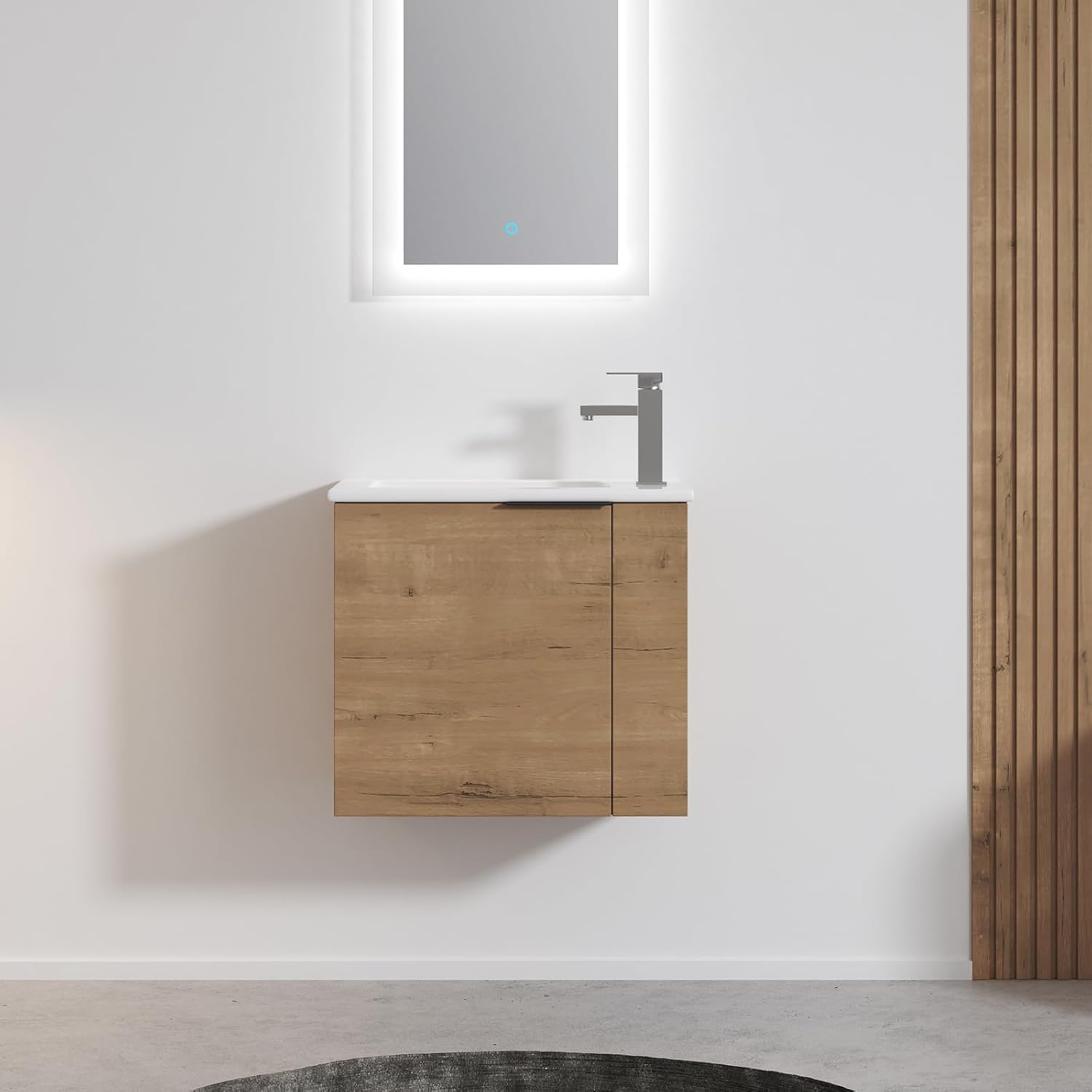 Transform your bathroom with this modern vanity cabinet featuring a sleek white sink mounted on light oak wood construction. The contemporary design combines functionality with style, offering valuable storage space beneath the elegant pedestal sink. The single-door cabinet provides ample room for organizing toiletries and bathroom essentials while maintaining a clean, minimalist appearance. The curved white sink basin creates a striking contrast against the natural wood tones, making it a standout piece in any bathroom decor. Assembly is straightforward, allowing for easy installation and setup. The durable construction ensures long-lasting use, while the black hardware accent adds a sophisticated touch. Perfect for small to medium-sized bathrooms, this vanity unit optimizes space efficiency without compromising on style. The light oak finish brings warmth to your bathroom while resisting daily wear and moisture exposure. Ideal for modern homes seeking a balance of practical storage and contemporary design.