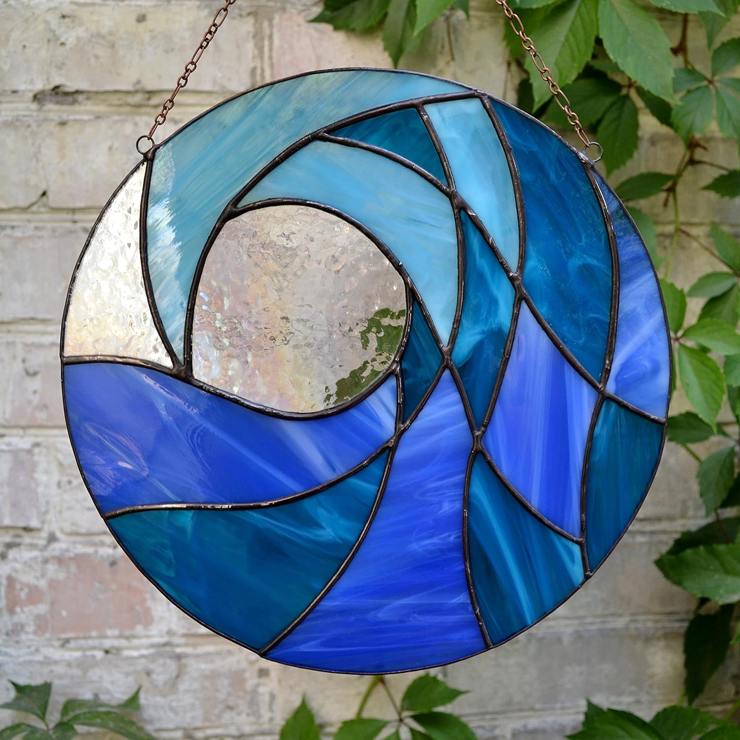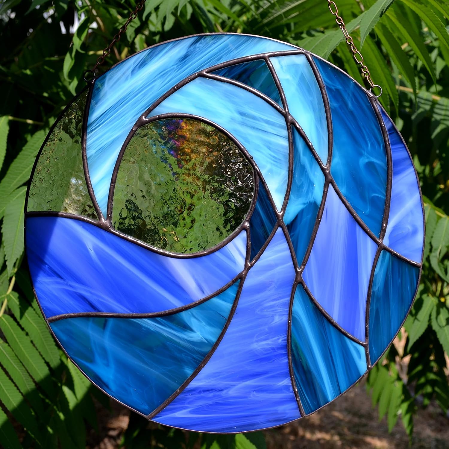 This round stained glass panel depicts a beauty of crashing ocean waves. The wave splash is made of three shades of blue, turquoise, marine and cobalt. The sky on the background is made of textured transparent glass with a rainbow effect. The suncatcher will bring to your home a feeling of coastal vibes and a sea breeze on your face all year long. The decoration will fit beautifully both as window hanging and wall decor. Great decorating idea for modern coastal style home interiors. Perfect addition to your living room, bedroom or kitchen, or even summer outdoors decor for patio or garden. The sun catcher makes the excellent gift for those hard to buy for and for a friend who loves seaside, beach, surfing and a coastal living.