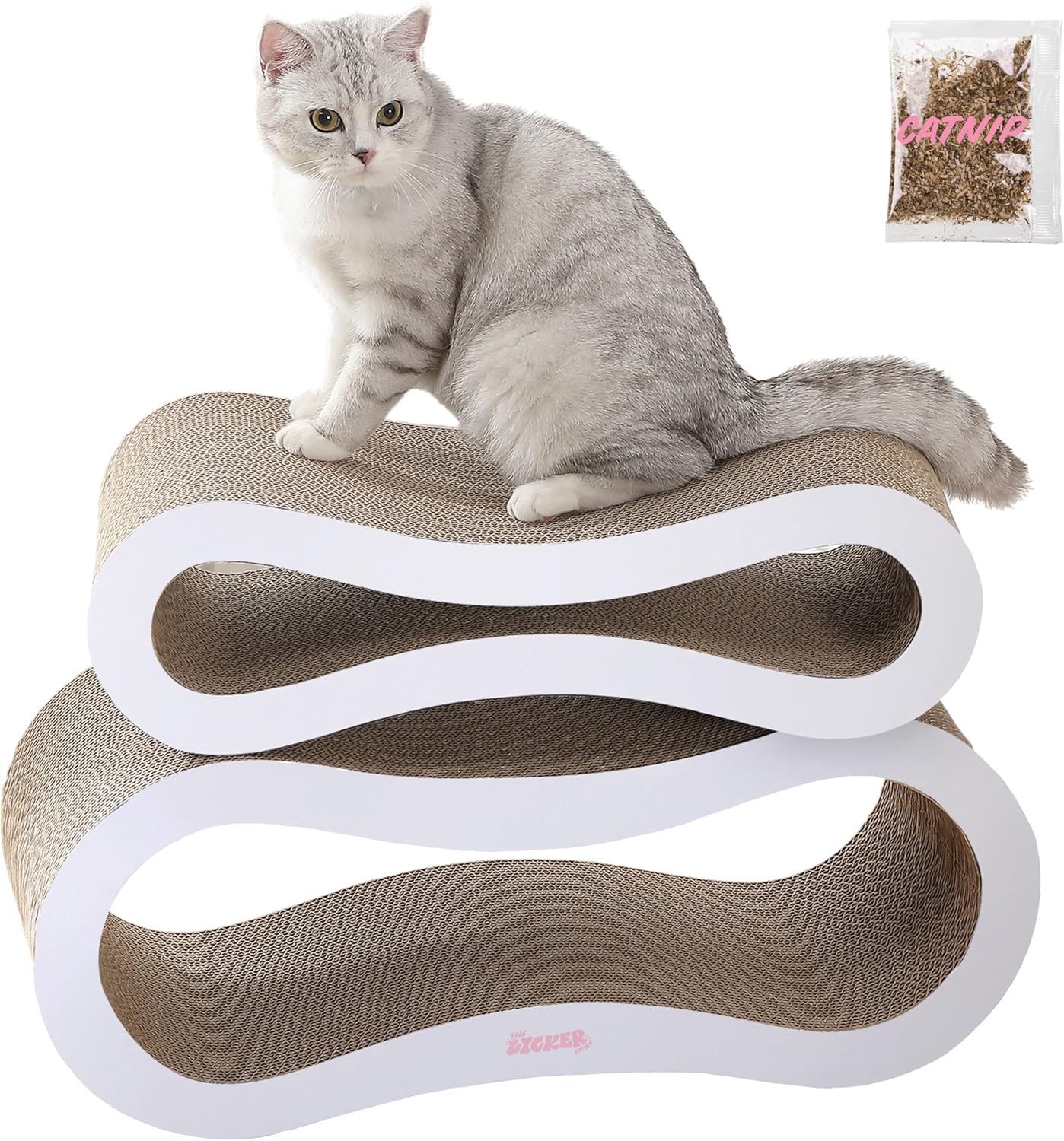 Keep cats active and healthy with this two-piece scratch and play set. This classic infinity design is made from corrugated cardboard that kitties love. Simply pull out the center to create a cat cave for stalking or hiding out.