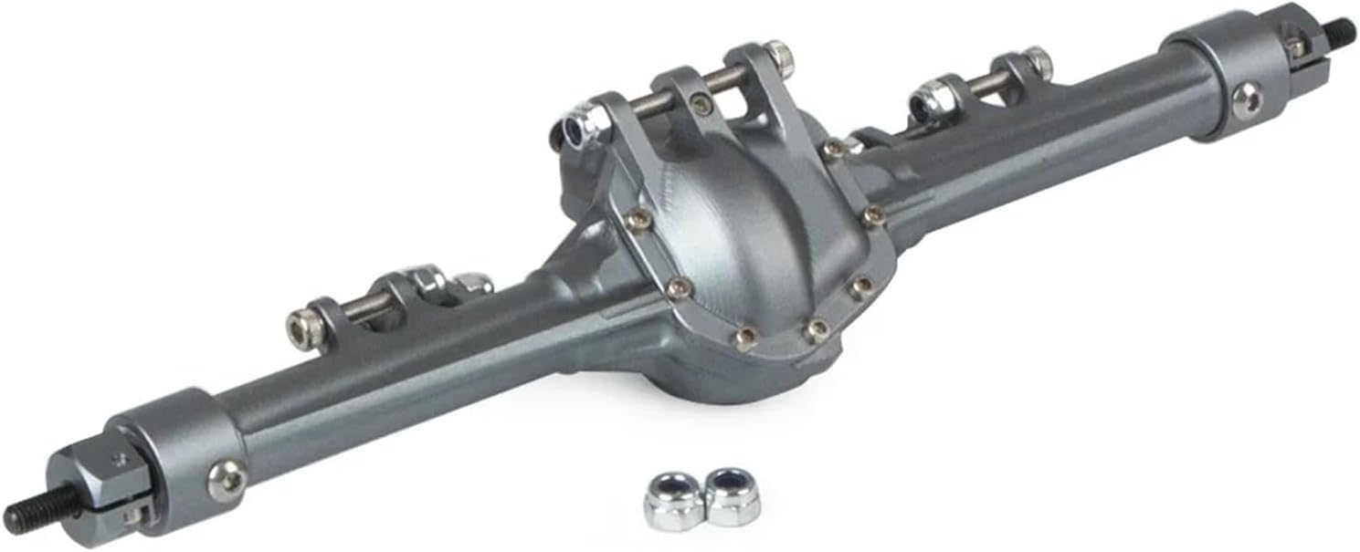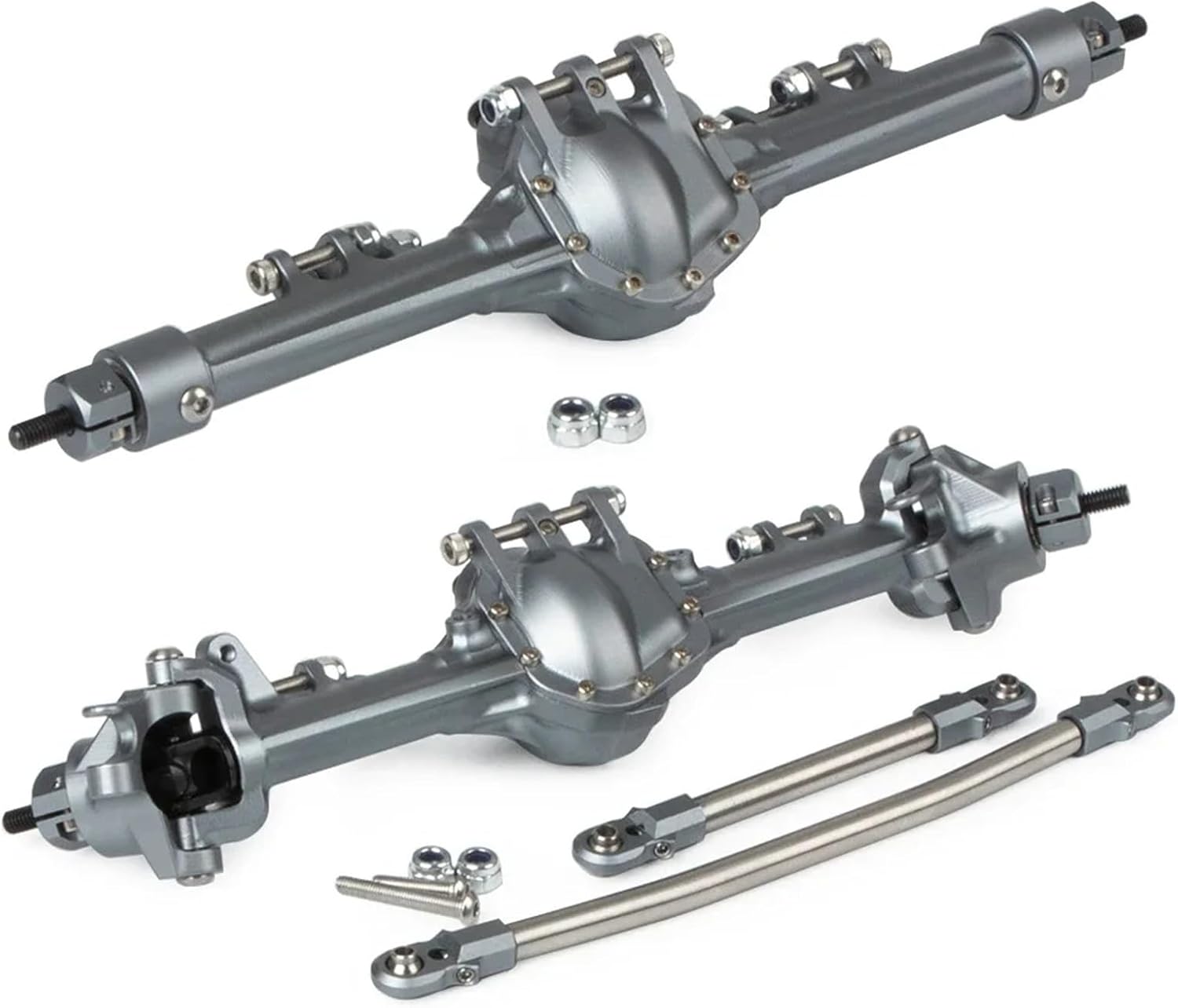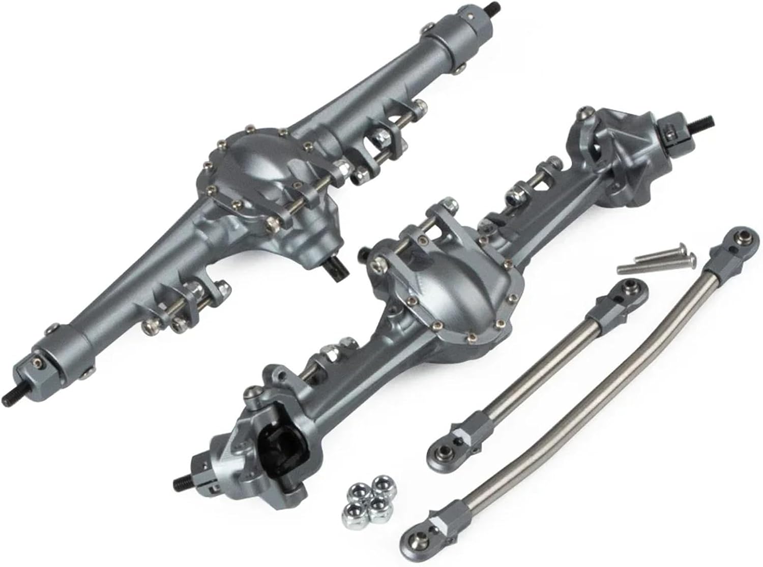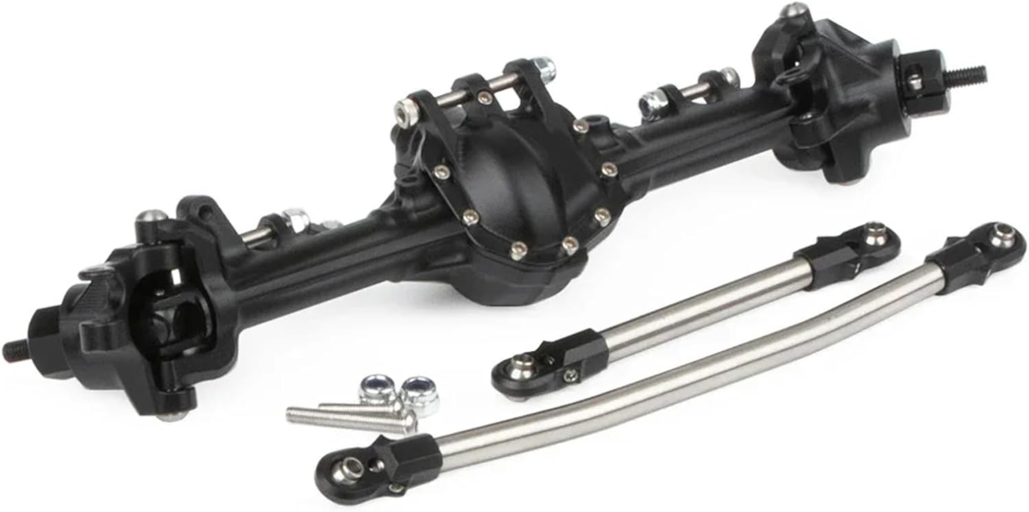 Features:6061 Aluminum HousingCNC MachinedAnodized Black / Clear / GrayIntegrated C-hub designUpper link mounts built into differential coverIncreased upper link clearanceCompatible with factory Axial SCX10 II linksHeavy duty hardened steel bevel gear set(30/8T)Hardened steel universal axle and straight axleUp to 46 degrees of steeringStainless steel steering/servo linkHigh Quality CNC Aluminum BallendsSpecifications:Material: 6061 AluminumColor: Black / Clear / GrayTotal Length: 215mmPin to Pin: 180mmPumpkin Height: 36mmInput Pinion Shaft: 5mmGear Ratio: 3.75 : 1Kingpin Inclination: 8 DegreesKingpin Caster: 12 DegreesWeight (Front Axle): 230gWeight (Rear Axle): 150gOptional Parts:Overdrive Gear Set 24T/8TOverdrive Gear Set 27T/8TUnderdrive Gear Set 33/8TServo on Axle MountImportant Notes1. Before you run the axles, make sure there is plenty of grease in the diff (enough to cover the gears)2. Fasten all screws securely.3. The jack in the photo is for showing the axle only,(Not Included)