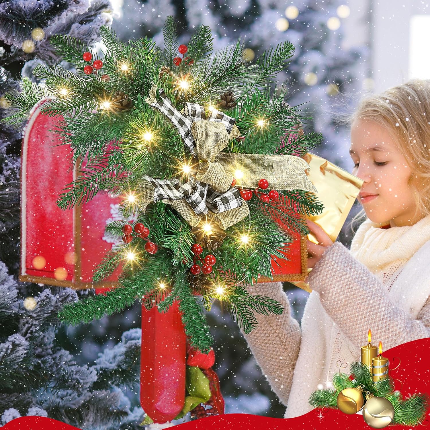 Features: What You Will Receive: You will receive 1 piece of Christmas mailbox swag and 1 piece of warm white LED lights, you can wrap it around the outdoor mailbox swags as you want, lighting up your yard in the darkBring the Holidays: Family and guests alike will happy as you transform your home into a winter holiday, capturing the beauty and charm of the holidays with our seasonal outdoor decor. Specifications: Main material: PVC materialColor: as the picture shownLight Size: 9.84 ft/3 meterPackage includes: 1 x Christmas mailbox swag 1 x Warm white LED lights Notes: Manual measurement, please allow slight errors on size. The color may exist a slight difference due to different screen displays. Winding risk may exist, please keep our product away from children.