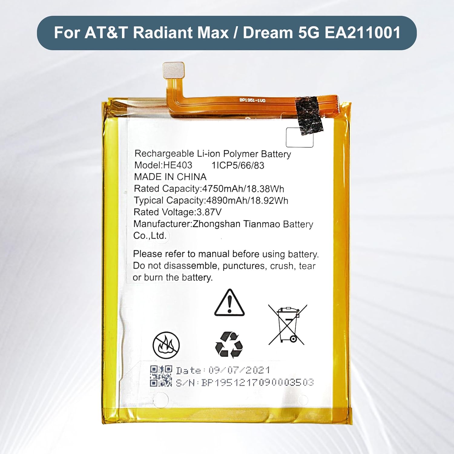 Item specsPart No:HE403Capacity:4890mAh/18.92WhVoltage:3.87VType:PolymerPackaging: 1 x battery,1x toolsCompatible withAT&T Radiant Max / Dream 5G EA211001 batteryNotice before purchase1. Be carefully check the model number of your device to see if this battery is compatible with your device.2. A new Li-ion battery will achieve its best performance after 2 or 3 complete cycles of charge & discharge.3. When you install it, be sure the connector has been properly connected to your device.4. Do not use low quality third-party adapter charger to charge your device, that will shorten the battery's life.Contact usIf you have any questions or any issues when using our product, please send us a message, we will answer you within 24 hrs. Thank you for your time.