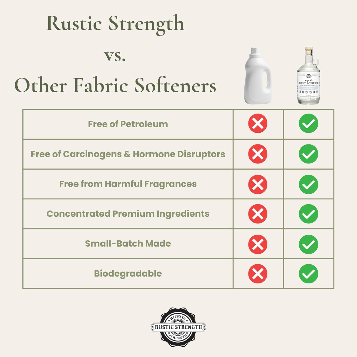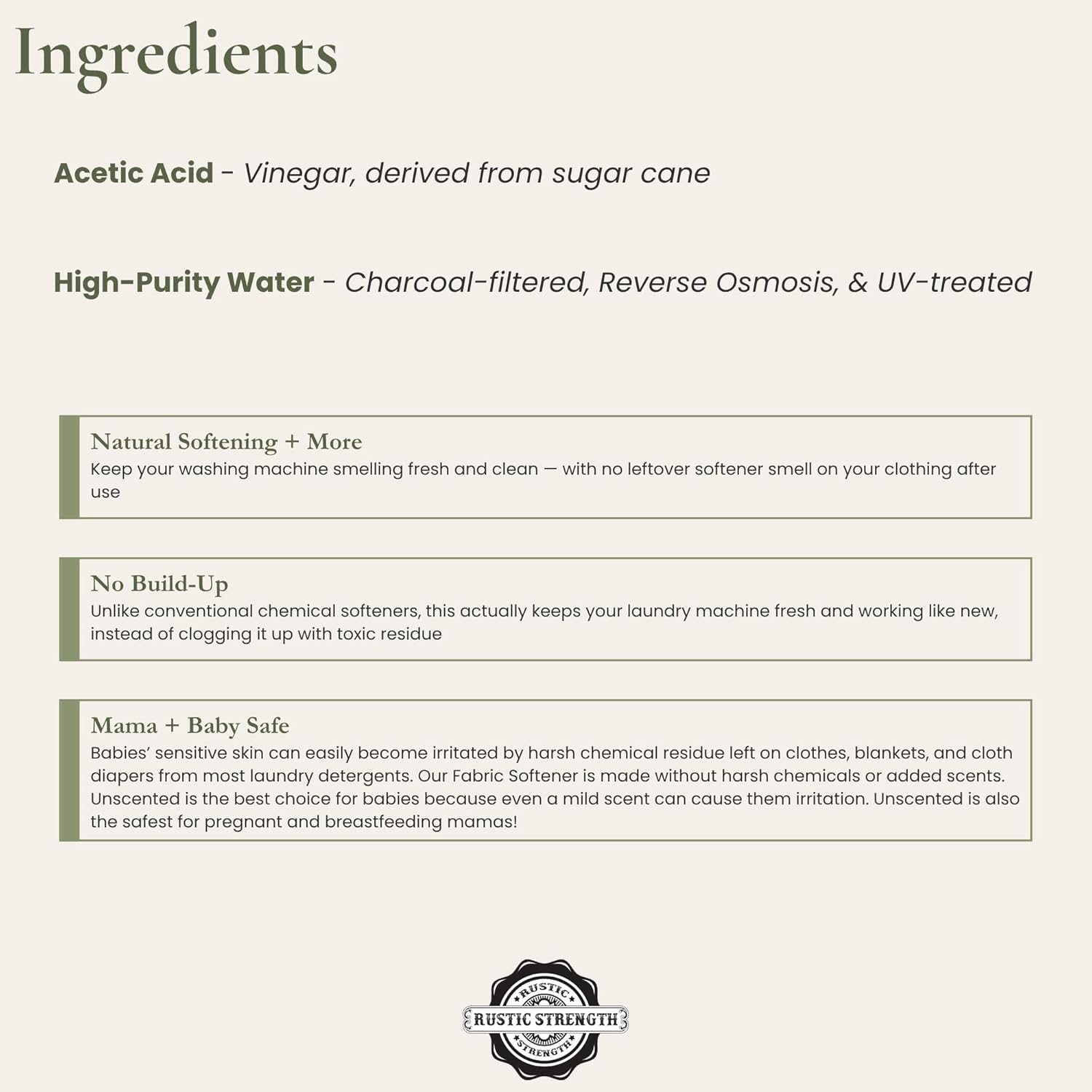 Experience softer, cleaner, fresher laundry โ naturally. Rustic Strength Natural Fabric Softener gently conditions fabrics without the harsh chemicals found in conventional softeners. Instead of leaving a coating on your clothing or washing machine, this plant- and mineral-based formula actually loosens buildup, helping your washer stay fresh, clean, and residue-free. With every use, this softener helps reduce static, repel lint and pet hair, and keep clothes feeling cleaner for longer. Its natural chelating properties loosen aluminum chloride and minerals like zinc and salt, helping prevent dirt from sticking to your clothing in the first place. Naturally deodorizing and 100% biodegradable, it freshens and softens while supporting a healthy, efficient washing machine โ with no lingering softener smell on your clothes. Compatitble with both regular and HE machines, this is the cleaner, safer way to soften your laundry. Small-batch crafted in Missouri by a family-owned company committed to non-toxic chemistry and honest ingredients.
